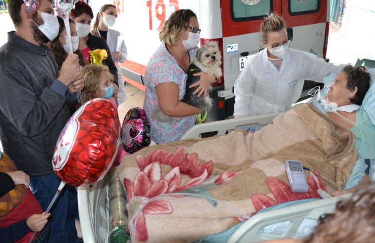 Paciente da UTI Geral do HRSP é conduzida até a parte externa do hospital para ver familiares